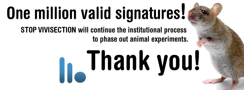 Die nationalen Behörden, die bislang die Gültigkeit der Unterstützungsbekunden zu prüfen hatten, haben nun den Initiatoren der Bürgerinitiative „Stop Vivisection“ bestätigt, dass von den 1.340.000 gesammelten Unterschriften auch 1 Millionen gültig sind, die für eine Weiterbehandlung der Bürgerinitiative erforderlich sind.